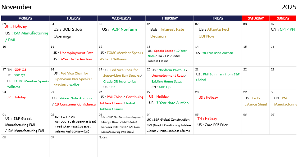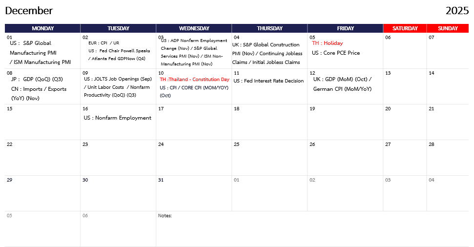 ช่วงต้นสัปดาห์ที่ผ่านมา ตลาดหุ้นทั่วโลกฟื้นตัวจากกลุ่มหุ้นที่เกี่ยวกับ AI โดยเฉพาะหุ้นที่อยู่ใน supply chain Ai Google หลังตลาดเริ่มปรับมุมมองธุรกิจ Ai ที่มีโอกาสและโครงสร้างการทำกำไรที่แข็งแกร่งมากกว่า Ai ที่ฉลาดแต่ใช้เงินลงทุนมากเกินไป และโอกาศในการลดดอกเบี้ยเพิ่มขึ้นหลังตัวเลขตลาดแรงงานยังสนับสนุนให้เกิดการลดดอกเบี้ยได้ ขณะที่ประธานเฟดสาขานิวยอร์กให้ความเห็นว่าเฟดยังลดดอกเบี้ยได้อีกมาก สนับสนุนการปรับตัวขึ้นของสินทรัพย์เสี่ยงช่วงสั้นก่อนจะเข้าสู้โหมดระมัดระวัง โดยในสัปดาห์นี้จะมีตัวเลขเศรษฐกิจสหรัฐฯและตัวเลขตลาดแรงงานสหรัฐฯที่ตลาดจับตาดูอย่างใกล้ชิด ประกอบกับการแถลงการณ์ของเจอโรม พาวเวล ที่จะให้ความเห็นเกี่ยวกับนโยบายการเงิน ส่วนทางด้านตลาดเงินดอลลาร์ทรงตัวแนวโน้มอ่อนค่าเล็กน้อยเมื่อเทียบกับอาทิตย์ก่อน ขณะที่ทองคำปรับขึ้นจากความคาดหวังลดดอกเบี้ยและความเสี่ยงที่นักลงทุนยังให้น้ำหนักอยู่