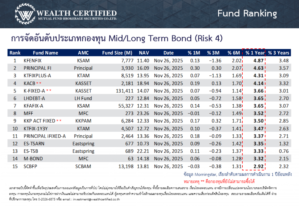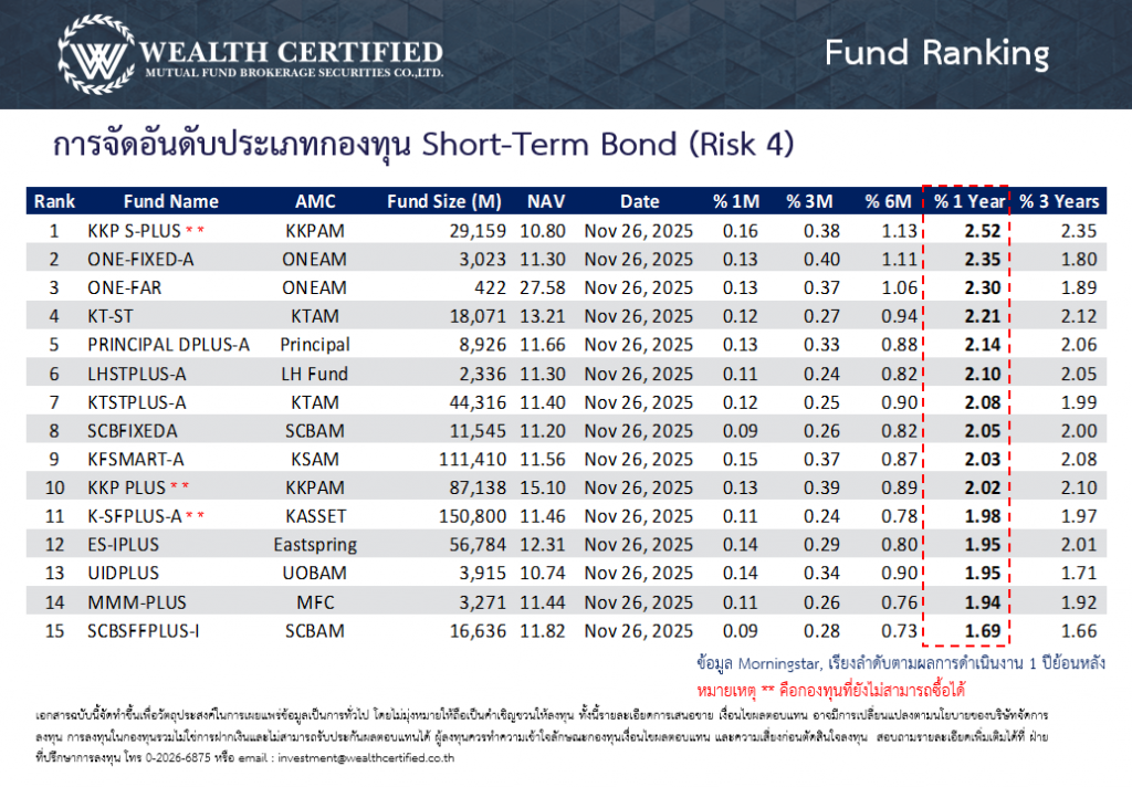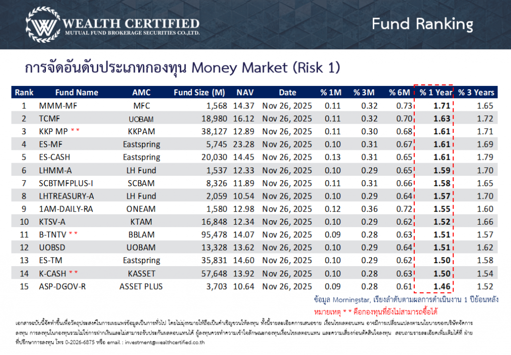จัดอันดับกองทุนพักเงินประจำสัปดาห์ วันที่ 01 ธันวาคม 2568 ประเภทกองทุนตลาดเงิน ตราสารหนี้ระยะสั้น และตราสารหนี้ระยะกลาง-ยาว โดยเรียงตามอัตราผลตอบแทนย้อนหลัง 1 ปี