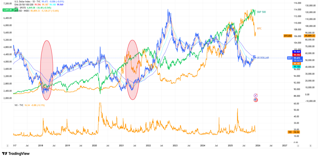 2. BTC ปรับตัวลดลงต่อเนื่องและตลาดหุ้นเริ่มปรับตัวลดลงตาม โดยดอลลาร์แข็งค่าขึ้น โอกาสที่ตลาดจะจบรอบทันที