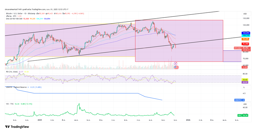 BTC ในระยะสั้นหลังจากมีประเด็นการทุบของรายใหญ่และการปิด Position Long จนเกิด short squeeze ปัจจุบันกราฟระยะสั้นเริ่มยืนได้ แต่ยังถูกกดดันต่อเนื่องจากกระแส Deleveraging BTC จากข่าว Phong Le (CEO ของ Strategy หรือชื่อเดิม MicroStrategy) ในช่วงปลายเดือนพฤศจิกายน 2025 ซึ่งสอดคล้องกับสถานการณ์ตลาดในช่วงเวลานั้นที่ราคาหุ้นของบริษัทเริ่มเทรดต่ำกว่ามูลค่า Bitcoin ที่ถืออยู่ (mNAV < 1)