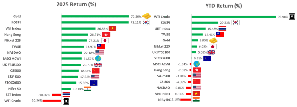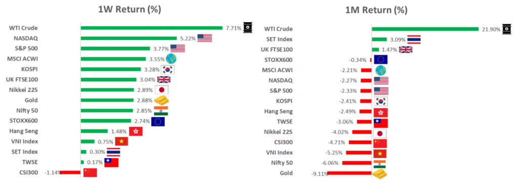 ตลาดหุ้นโลกในสัปดาห์ที่ผ่านมาเคลื่อนไหวในลักษณะ “รีบาวด์ภายใต้ความผันผวนสูง” โดยแรงหนุนหลักมาจากกระแสข่าวความเป็นไปได้ของการลดความตึงเครียดในตะวันออกกลาง ซึ่งช่วยให้ sentiment กลับมาเป็น risk-on ชั่วคราวหลังจากก่อนหน้าตลาดถูกกดดันอย่างหนัก อย่างไรก็ตาม การปรับขึ้นยังไม่ใช่การฟื้นตัวจากปัจจัยพื้นฐาน แต่เป็นเพียง relief rally เนื่องจากสถานการณ์ระหว่าง สหรัฐอเมริกา และ อิหร่าน ยังไม่มีความชัดเจน และมีข่าวสลับระหว่างการเจรจากับความเสี่ยง escalation ฝั่งตลาดหุ้นสหรัฐมีแรงซื้อกลับในหุ้นขนาดใหญ่โดยเฉพาะกลุ่ม ส่วนในยุโรป แม้ตลาดปรับขึ้นตาม global sentiment แต่ถูกจำกัดด้วยความเสี่ยงด้านพลังงาน ขณะที่เอเชียเป็นภูมิภาคที่ผันผวนมากที่สุด โดยตลาดอย่างญี่ปุ่นและเกาหลีเคลื่อนไหวตามทั้งทิศทางราคาน้ำมันและกระแสเงินทุน แม้ fund flow เริ่มไหลกลับเข้าสินทรัพย์เสี่ยง โดยทิศทางในระยะถัดไปจะยังขึ้นอยู่กับพัฒนาการของสงคราม ราคาพลังงาน และแนวโน้มเงินเฟ้อเป็นหลัก