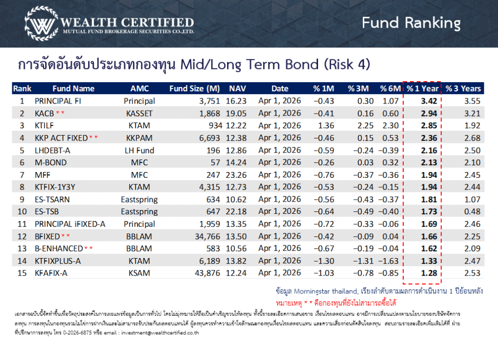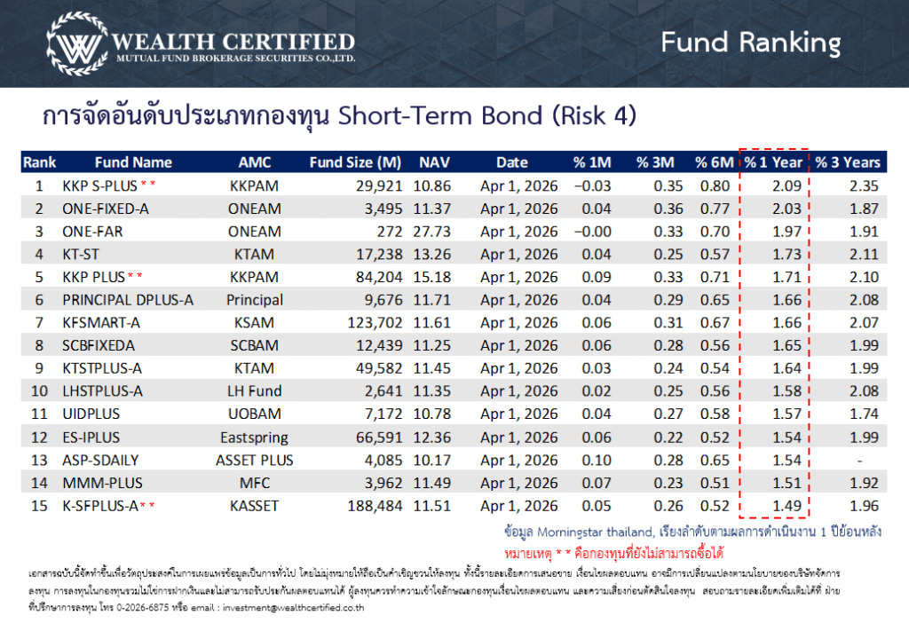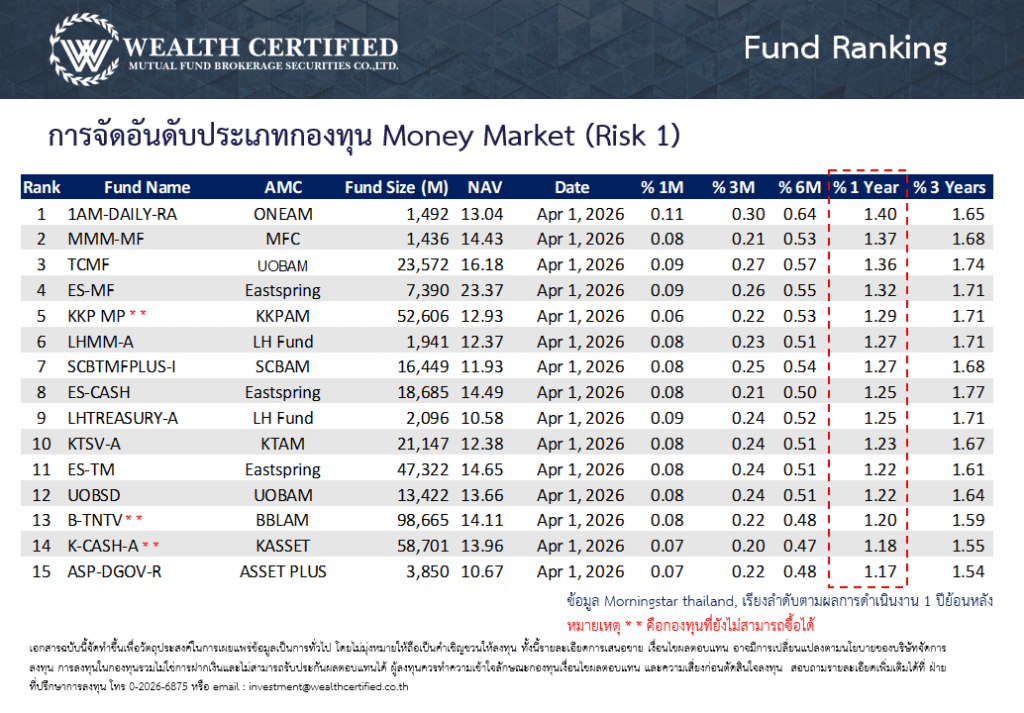 จัดอันดับกองทุนพักเงินประจำสัปดาห์ วันที่ 01 เมษายน 2569 ประเภทกองทุนตลาดเงิน ตราสารหนี้ระยะสั้น และตราสารหนี้ระยะกลาง-ยาว โดยเรียงตามอัตราผลตอบแทนย้อนหลัง 1 ปี