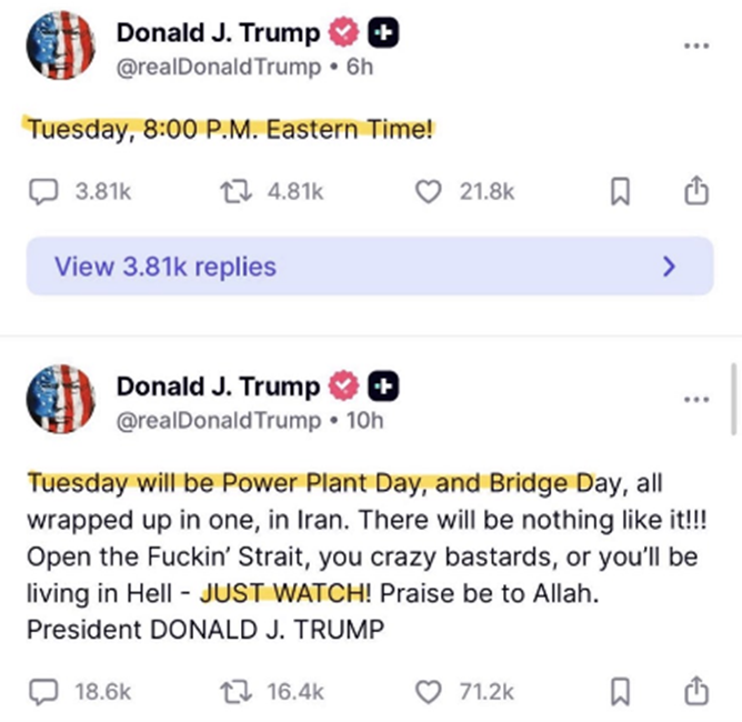 ทรัมป์ตั้งเส้นตายให้อิหร่านเปิดช่องแคบฮอร์มุซภายใน 20.00 น. ET วันอังคาร (ตีหนึ่งของวันพุธตามเวลา GMT) โดยโพสต์ลง Truth Social ขู่ว่า “Tuesday will be Power Plant Day and Bridge Day” พร้อมภาษาหยาบรุนแรง