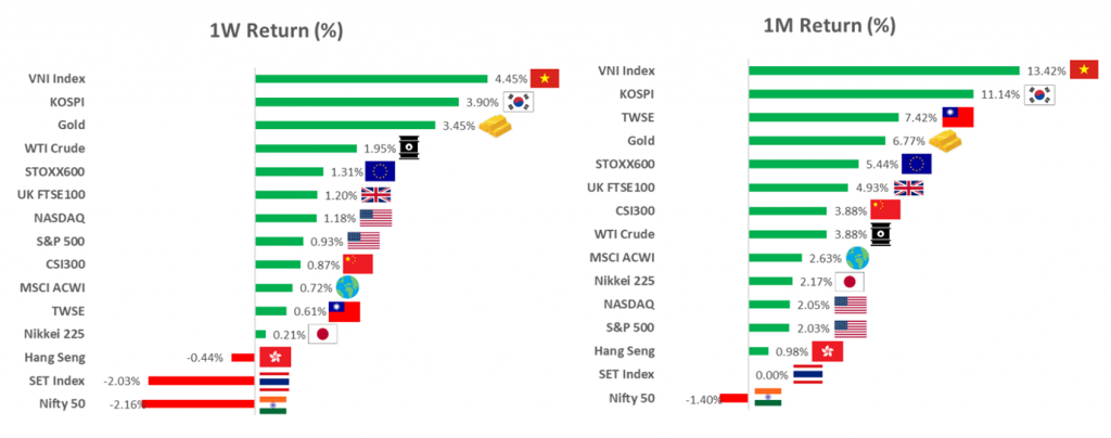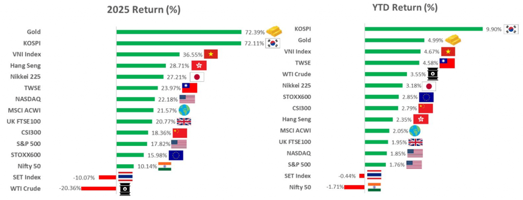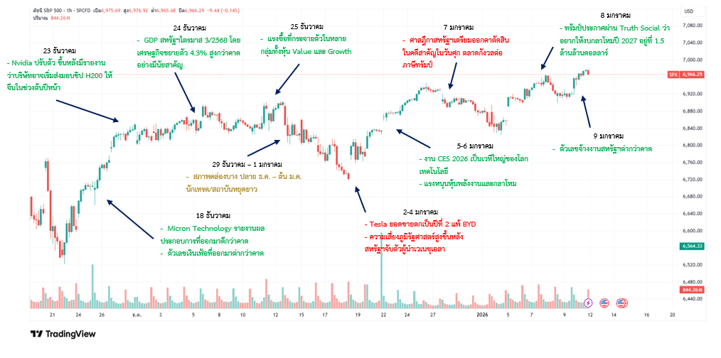 ตลาดหุ้นทั่วโลกในสัปดาห์ที่ผ่านมาเคลื่อนไหวในแดนบวกเป็นส่วนใหญ่ โดยแรงหนุนหลักในช่วงต้นสัปดาห์มาจากตลาดหุ้นสหรัฐฯ ที่ได้อานิสงส์จากข้อมูลเงินเฟ้อซึ่งชะลอตัวลงมากกว่าคาด ส่งผลให้ความกังวลด้านนโยบายการเงินผ่อนคลายลง ช่วยหนุนความเชื่อมั่นของนักลงทุน โดยนช่วงปลายสัปดาห์มีข่าวทรัมป์มีการโพสผ่าน tooth social ว่าต้องการเพิ่มงบกลาโหมอีกทำให้ตลาดเล่นหุ้นในตีม Defense และนอกจากนนี้ตลาดมมีการย้ายเม็ดเงินจากหุ้นที่เคยขึ้นมาตลอดในปีก่อนเข้าหุ้นที่มีพื้นฐานที่เกี่ยวกับโครงสร้างพื้นฐาน AI ที่จะมีรายได้แน่นอนหาก AI ยังคงเติบโตต่อเนื่อง ด้านตลาดหุ้นเอเชียเคลื่อนไหวผันผวน ภาพรวมตลาดยังอยู่ในภาวะ Risk-off แต่มีการเลือกและสนใจประเด็นบวกเฉพาะตัวหุ้นมากขึ้น
