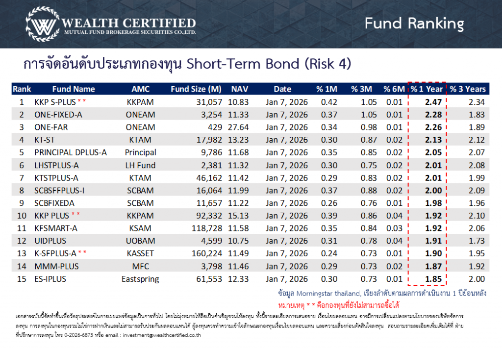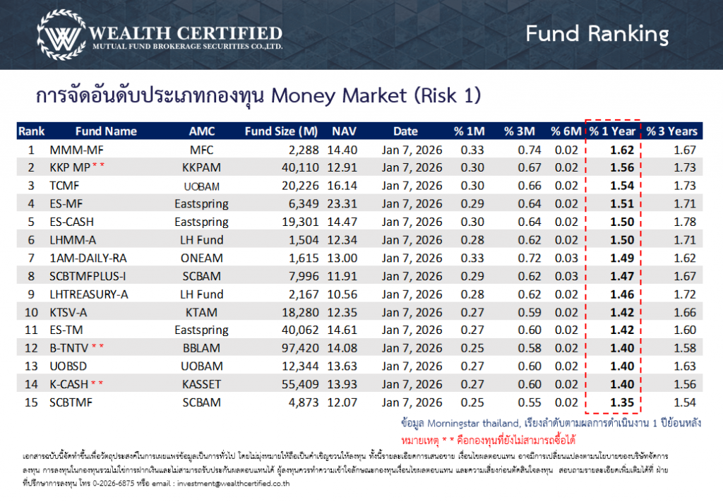 จัดอันดับกองทุนพักเงินประจำสัปดาห์ วันที่ 29 ธันวาคม 2568 ประเภทกองทุนตลาดเงิน ตราสารหนี้ระยะสั้น และตราสารหนี้ระยะกลาง-ยาว โดยเรียงตามอัตราผลตอบแทนย้อนหลัง 1 ปี