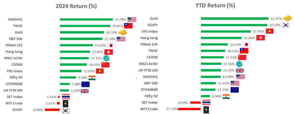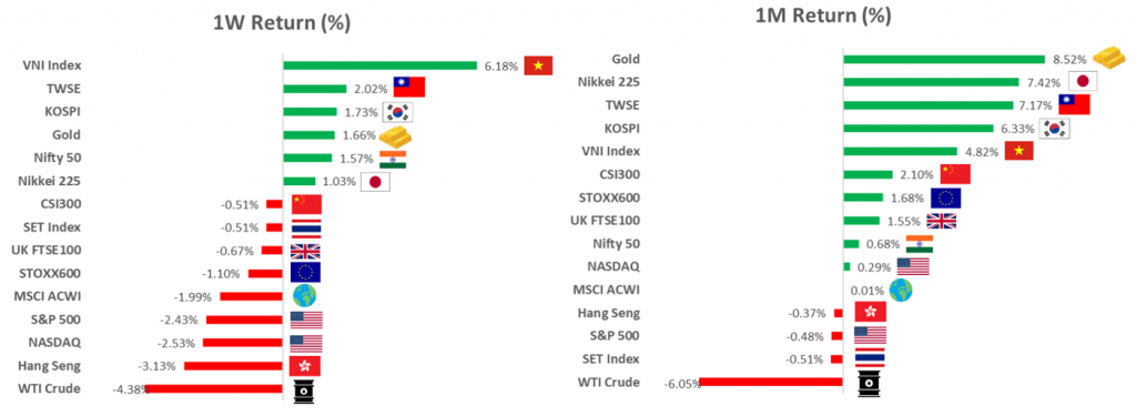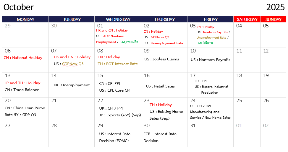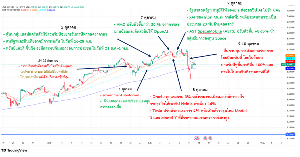 สัปดาห์ที่ผ่านมา ตลาดหุ้นทั่วโลกเริ่มพักฐานจากข่าวการประกาศมาตราการควบคุมแร่หายากของจีนและการตอบโต้ของทรัมป์ในการขู่ขึ้นภาษีต่อจีนถึง 100% และได้มีการบอกว่าอาจไม่จำเป็นต้องไปพบที่งานเกาหลีใต้ซึ่งเดิมจะพบกันฝนช่วงปลายเดือนนี้ ทำให้ตลาดเกิดแรงขายทำกำไรลดความเสี่ยงจากก่อนหน้านี้ที่ปรับตัวขึ้นมาต่อเนื่องจากข่าวดีหลายประการเช่น การอนุมัติให้ Nvidia ส่งออกชิป AI ไปยัง UAE หรือข่าวการลงทุนของ xAI ของ Elon Musk ที่ได้มีการเพิ่มวงเงินระดมทุนรวมเป็น 20 พันล้านดอลลาร์ นอกจากนี้ตลาดยังจับตาการปิดรัฐบาลของสหรัฐฯที่ยังดำเนินต่อไปอาจยืดเยื้อนานหรือไม่และการประชุม Fed ครั้งถัดไปซึ่งคาดหวังการลดดอกเบี้ยรวมถึงการประกาศงบไตรมาส 3 ของบรรดาหุ้นเทคโนโลยีต่างๆที่จะประกาศช่วงปลายเดือน ส่วนทางด้านทองคำยังปรับตัวเพิ่มขึ้นต่อเนื่องจากความเสี่ยงรอบด้านและความไม่แน่นอนที่มากขึ้น และค่าเงินดอลลาร์อาทิตย์ที่ผ่านมีการปรับตัวแข็งค่าขึ้น