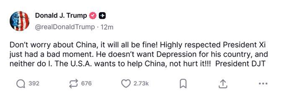 แต่หลังจากทรัมป์ได้โพสบอกว่าไม่ต้องกังวลและาหรัฐฯและจีนคงไม่อยากซ้ำเติมเศรษฐกิจที่กำลังเปาะบาง หลังจากนั้นตลาดก็ปรับตัวเพิ่มขึ้นรีบาวด์ได้