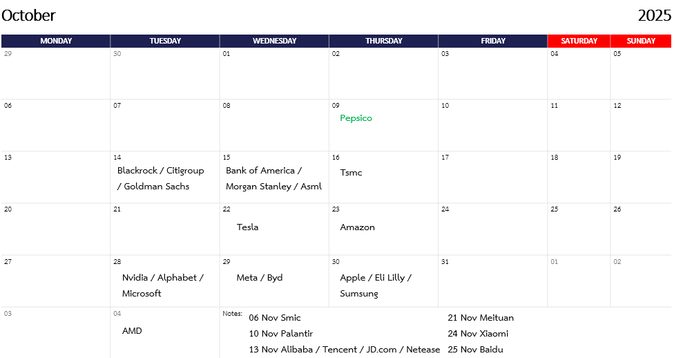 ภาพรวมตัวเลขเศรษฐกิจสัปดาห์ทางสหรัฐฯยังไม่สามารถประกาศตัวเลขสำคัญได้เนื่องจากการปิดตัวของรัฐบาลสหรัฐฯที่ยังดำเนินต่อเนื่อง ขณะที่ทางด้านงบไตรมาส 3 ของบริษัทในสหรัฐฯหลายบริษัทใกล้ประกาศงบ ขณะที่จีนประกาศช่วงเดือนหน้า ภาพรวมผลประกอบการณ์คดว่าจะยังเติบโตดีซึ่งอาจช่วยพยุงตลาดได้