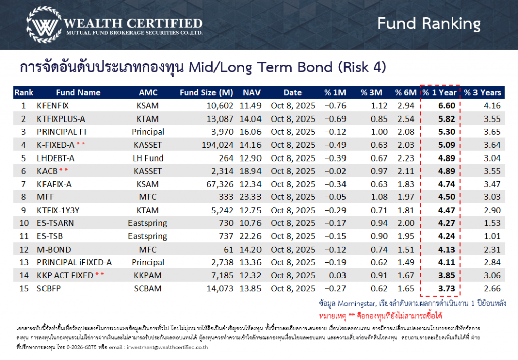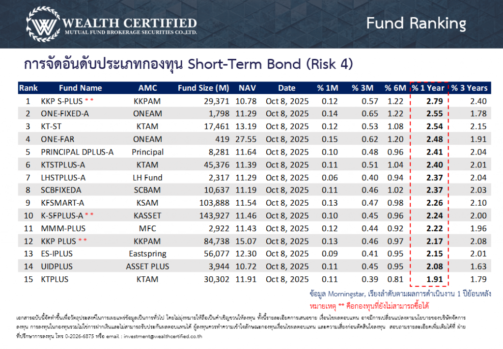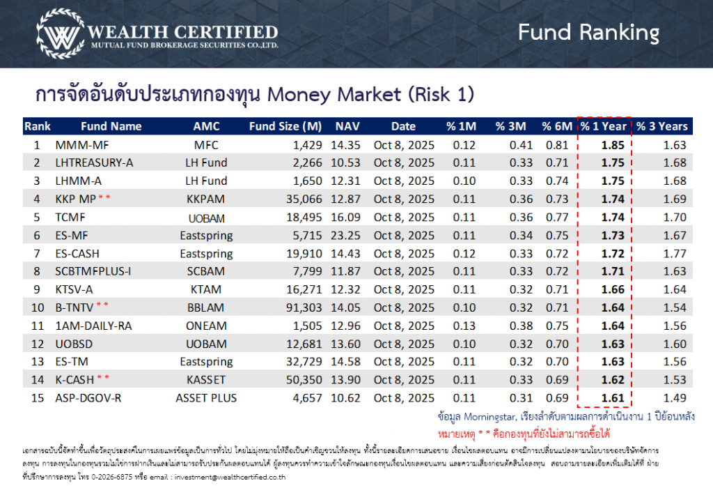 จัดอันดับกองทุนพักเงินประจำสัปดาห์ วันที่ 29 กันยายน 2568 ประเภทกองทุนตลาดเงิน ตราสารหนี้ระยะสั้น และตราสารหนี้ระยะกลาง-ยาว โดยเรียงตามอัตราผลตอบแทนย้อนหลัง 1 ปี