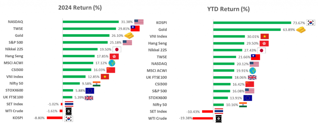 ตลาดหุ้นทั่วโลกปรับตัวลดลงหลังจากฟื้นตัวก่อนหน้าจากกรผ่อนคลายนโยบายการเงิน ขณะที่ Bond yield เริ่มปรับตัวขึ้นเพราะมองว่าปีหน้าการลดดอกเบี้ยมีความแน่นอนส่งผลให้ Bond yield ปรับตัวขึ้นกดดันสินทรัพย์เสี่ยงทำให้ Earning Yield Gap โดยรวมมีแนวโน้มแคบกว่าสัปดาห์ที่ผ่านมา