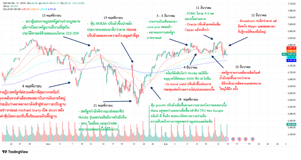 ตลาดหุ้นทั่วโลกปรับตัวขึ้นในช่วงต้นสัปดาห์ จากความคาดหวังและต่อมาคือการประกาศลดดอกเบี้ยของเฟด ซึ่งช่วยหนุนบรรยากาศการลงทุนโดยรวม ก่อนที่ตลาดจะเผชิญแรงกดดันอีกครั้งในช่วงปลายสัปดาห์จากการปรับตัวลงของหุ้นเทคโนโลยีขนาดใหญ่ โดยเฉพาะ Oracle และ Broadcom ก่อนการประชุมเฟด อัตราผลตอบแทนพันธบัตรรัฐบาลสหรัฐฯ ปรับตัวสูงขึ้น สะท้อนความกังวลต่อความไม่แน่นอนของทิศทางดอกเบี้ย แม้จะมีปัจจัยบวกจากข่าวที่รัฐบาลทรัมป์อนุญาตให้ Nvidia ส่งออกชิป AI รุ่น H200 ไปยังจีน ด้านผลการประชุม FOMC เฟดมีมติ 9–3 ลดดอกเบี้ยตามคาด แต่แรงหนุนจากนโยบายการเงินถูกหักล้างบางส่วนจากความกังวลเชิงโครงสร้าง โดยเฉพาะการที่ Oracle ปรับเพิ่มงบลงทุน (Capex) แม้งบออกมาดีกว่าคาด ขณะเดียวกัน ภาคพลังงานเผชิญแรงกดดันหลังสหรัฐฯ รายงานสต็อกน้ำมันเพิ่มขึ้นมากกว่าคาด และอิรักสามารถกลับมาผลิตจากแหล่งขนาดใหญ่ได้อีกครั้ง ส่งผลให้ภาพรวมตลาดยังเป็นการฟื้นตัวที่เปราะบาง โดยนักลงทุนยังคงระมัดระวังความผันผวนในระยะถัดไป