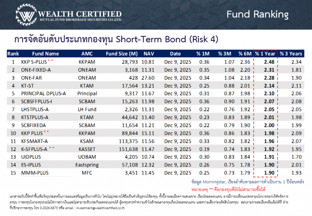 จัดอันดับกองทุนพักเงินประจำสัปดาห์ วันที่ 08 ธันวาคม 2568 ประเภทกองทุนตลาดเงิน ตราสารหนี้ระยะสั้น และตราสารหนี้ระยะกลาง-ยาว โดยเรียงตามอัตราผลตอบแทนย้อนหลัง 1 ปี