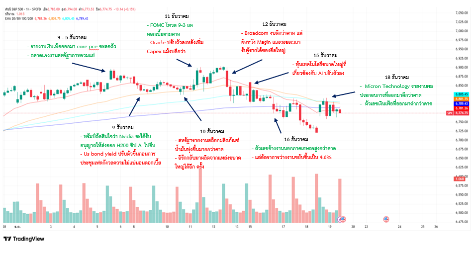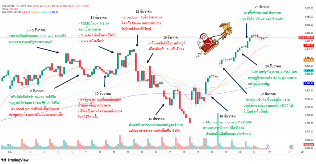 ตลาดหุ้นทั่วโลกเคลื่อนไหวปรับขึ้นได้ดีท่ามกลางสภาพคล่องที่ลดลงก่อนวันหยุดยาว โดยช่วงต้นสัปดาห์ตลาดปรับตัวขึ้นได้ดีจากหุ้นเทคโนโลยี หลังเงินเฟ้อสหรัฐออกมาต่ำกว่าคาดและผลประกอบการ Micron ดีกว่าคาด ก่อนที่จะเริ่มหมุนเม็ดเงินเข้าสู่หุ้น Defensive ขณะที่ตลาดเอเชียอ่อนตัวเป็นระยะ โดยญี่ปุ่นรับรู้ผลประชุม BOJ ที่เป็นไปตามคาดและยังไม่ส่งสัญญาณขึ้นดอกเบี้ยชัดเจน ทำให้เงินเยนอ่อนค่าต่อเนื่อง ช่วงปลายสัปดาห์บรรยากาศการลงทุนเบาบางขึ้นก่อนเข้าสู่วันหยุดยาว ด้านสินทรัพย์ปลอดภัยอย่างทองคำปรับตัวขึ้นเด่นสุดในสัปดาห์ที่ผ่านมาโดยขึ้นควบคู่กับดัชนีหุ้นสหรัฐฯนักลงทุนยังไม่แน่ใจถึงแนวโน้มในปีหน้าทำให้เกิดการลดความเสี่ยงโดยการลงทุนในทองคำ ขณะที่ดอลลาร์สหรัฐอ่อนค่าเล็กน้อยจากภาวะระมัดระวังความเสี่ยงของนักลงทุน