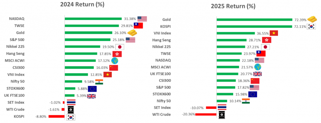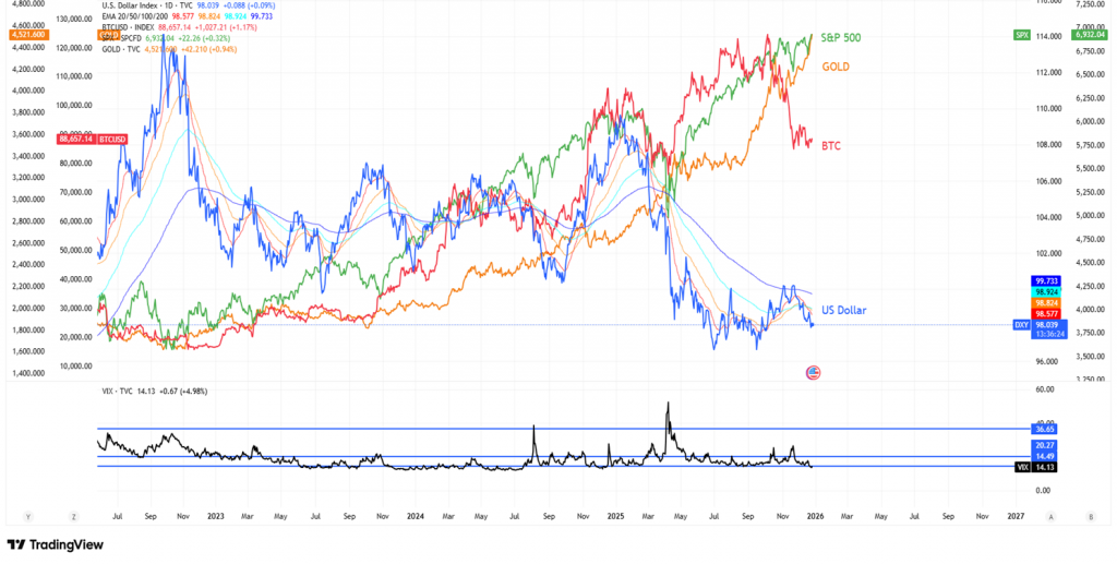 ภาพรวมตลาดในกราฟนี้อยู่ในสภาวะ Risk-On เต็มรูปแบบ (นักลงทุนกล้าเสี่ยง) ขับเคลื่อนด้วยธีมหลักคือ “การเสื่อมค่าของเงินดอลลาร์สหรัฐฯ” (Dollar Debasement) เมื่อดอลลาร์อ่อนค่าลง สินทรัพย์ทุกประเภทไม่ว่าจะเป็นหุ้น ทองคำ หรือบิทคอยน์ ต่างพากันปรับตัวขึ้นทำจุดสูงสุดใหม่ (All-Time Highs)