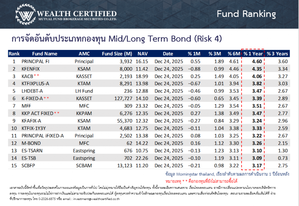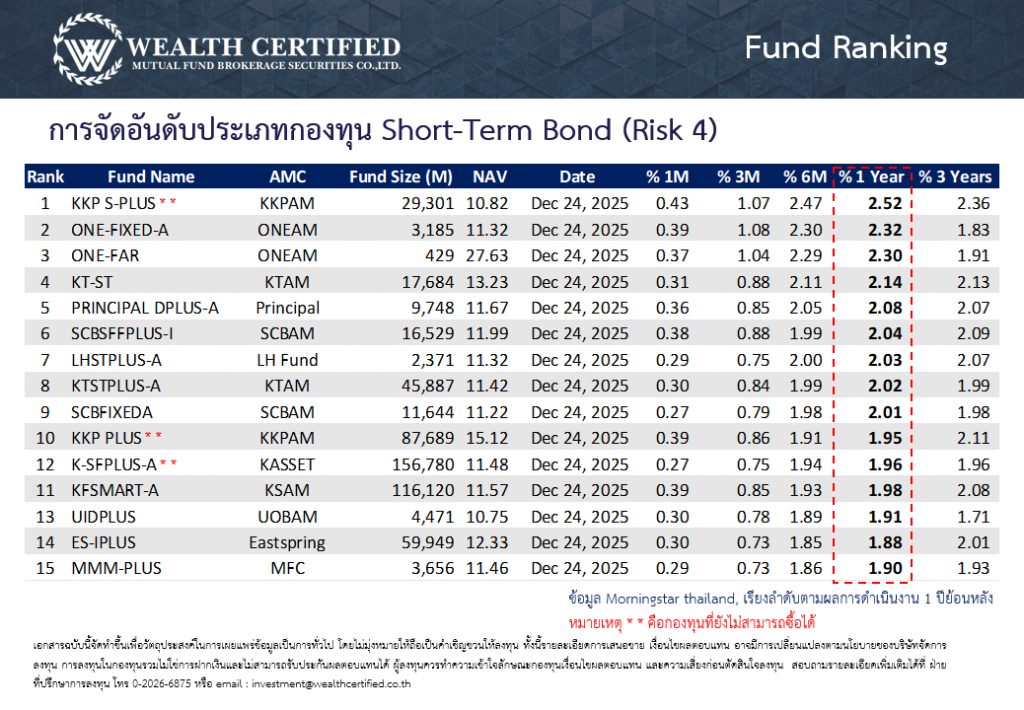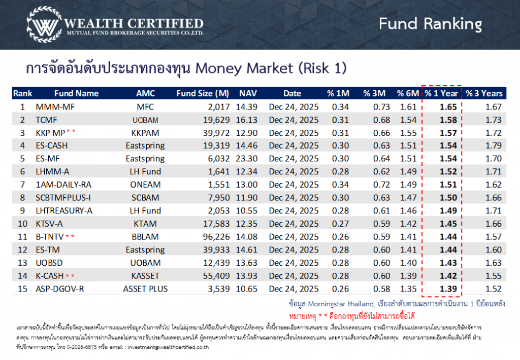 จัดอันดับกองทุนพักเงินประจำสัปดาห์ วันที่ 29 ธันวาคม 2568 ประเภทกองทุนตลาดเงิน ตราสารหนี้ระยะสั้น และตราสารหนี้ระยะกลาง-ยาว โดยเรียงตามอัตราผลตอบแทนย้อนหลัง 1 ปี